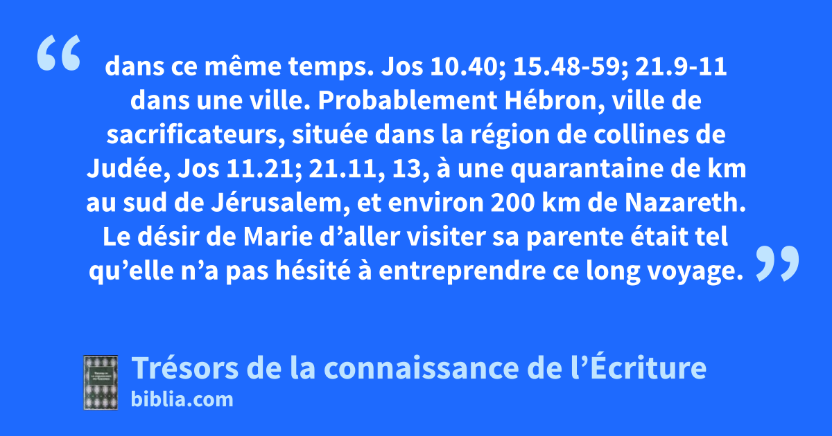 dans ce même temps. Jos 10.40; 15.48-59; 21.9-11 dans une ville. Probablement Hébron, ville de sacrificateurs, située dans la région de collines de Judée, Jos 11.21; 21.11, 13, à une quarantaine de km au sud de Jérusalem, et environ 200 km de Nazareth. Le désir de Marie d’aller visiter sa parente était tel qu’elle n’a pas hésité à entreprendre ce long voyage.