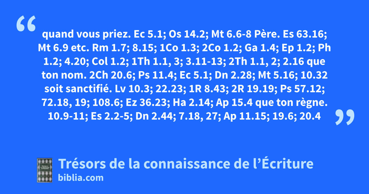 quand vous priez. Ec 5.1; Os 14.2; Mt 6.6-8 Père. Es 63.16; Mt 6.9 etc. Rm 1.7; 8.15; 1Co 1.3; 2Co 1.2; Ga 1.4; Ep 1.2; Ph 1.2; 4.20; Col 1.2; 1Th 1.1, 3; 3.11-13; 2Th 1.1, 2; 2.16 que ton nom. 2Ch 20.6; Ps 11.4; Ec 5.1; Dn 2.28; Mt 5.16; 10.32 soit sanctifié. Lv 10.3; 22.23; 1R 8.43; 2R 19.19; Ps 57.12; 72.18, 19; 108.6; Ez 36.23; Ha 2.14; Ap 15.4 que ton règne. 10.9-11; Es 2.2-5; Dn 2.44; 7.18, 27; Ap 11.15; 19.6; 20.4