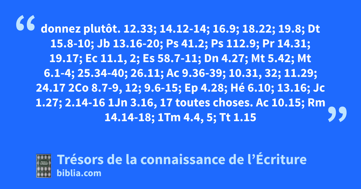 donnez plutôt. 12.33; 14.12-14; 16.9; 18.22; 19.8; Dt 15.8-10; Jb 13.16-20; Ps 41.2; Ps 112.9; Pr 14.31; 19.17; Ec 11.1, 2; Es 58.7-11; Dn 4.27; Mt 5.42; Mt 6.1-4; 25.34-40; 26.11; Ac 9.36-39; 10.31, 32; 11.29; 24.17 2Co 8.7-9, 12; 9.6-15; Ep 4.28; Hé 6.10; 13.16; Jc 1.27; 2.14-16 1Jn 3.16, 17 toutes choses. Ac 10.15; Rm 14.14-18; 1Tm 4.4, 5; Tt 1.15