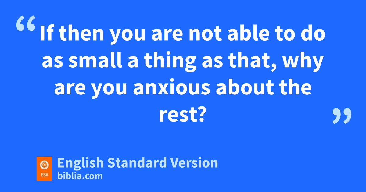 22 And he said to his disciples, f“Therefore I tell you, gdo not be anxious about your life, what you will eat, nor about your body, what you will put on. 23 For life is more than food, and the body more than clothing. 24 hConsider the ravens: they neither sow nor reap, they have neither storehouse nor barn, and yet God feeds them. iOf how much more value are you than the birds! 25 And which of you by being anxious can add a single hour to his jspan of life?3 26 If then you are not able to do as small a thing as that, why are you anxious about the rest? 27 Consider the lilies, how they grow: they neither toil nor spin, yet I tell you, keven Solomon in all his glory was not arrayed like one of these. 28 But if God so clothes the grass, which is alive in the field today, and tomorrow is thrown into the oven, how much more will he clothe you, lO you of little faith! 29 And do not seek what you are to eat and what you are to drink, nor mbe worried. 30 For nall the nations of the world seek after these things, and nyour Father knows that you need them. 31 Instead, oseek phis4 kingdom, qand these things will be added to you.