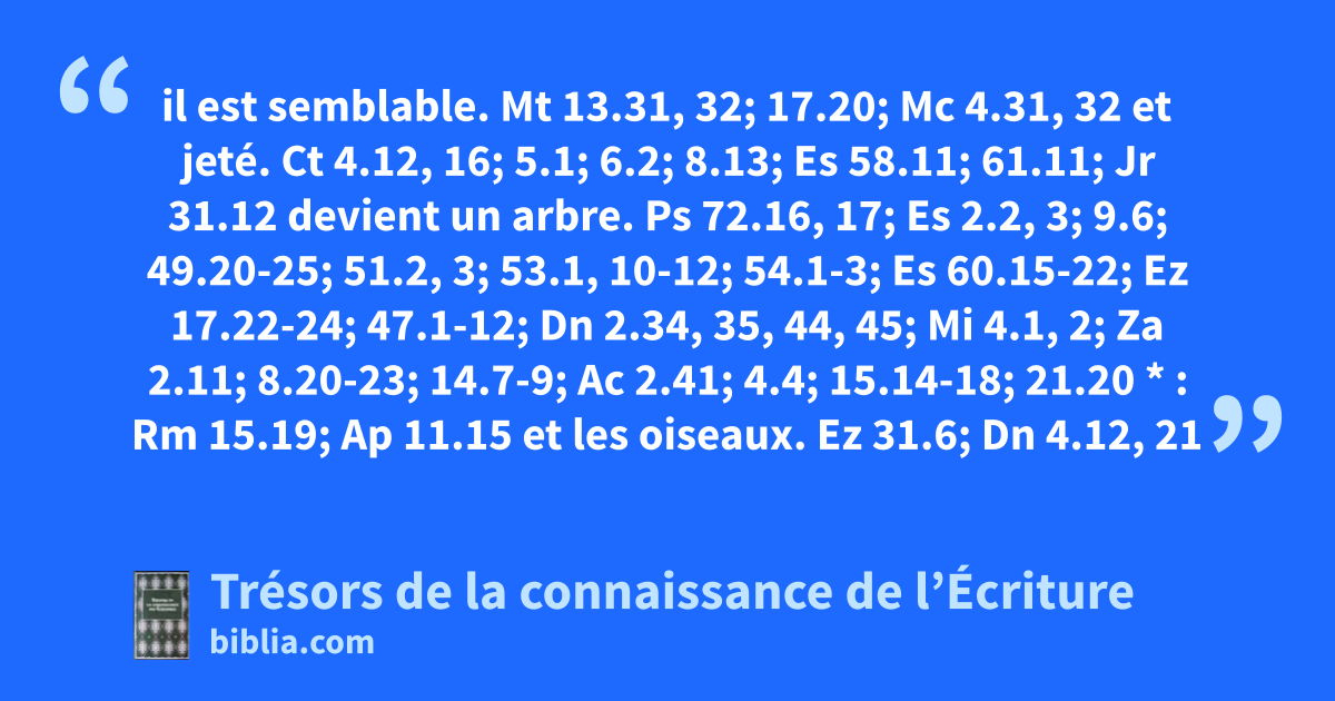 il est semblable. Mt 13.31, 32; 17.20; Mc 4.31, 32 et jeté. Ct 4.12, 16; 5.1; 6.2; 8.13; Es 58.11; 61.11; Jr 31.12 devient un arbre. Ps 72.16, 17; Es 2.2, 3; 9.6; 49.20-25; 51.2, 3; 53.1, 10-12; 54.1-3; Es 60.15-22; Ez 17.22-24; 47.1-12; Dn 2.34, 35, 44, 45; Mi 4.1, 2; Za 2.11; 8.20-23; 14.7-9; Ac 2.41; 4.4; 15.14-18; 21.20 * : Rm 15.19; Ap 11.15 et les oiseaux. Ez 31.6; Dn 4.12, 21
