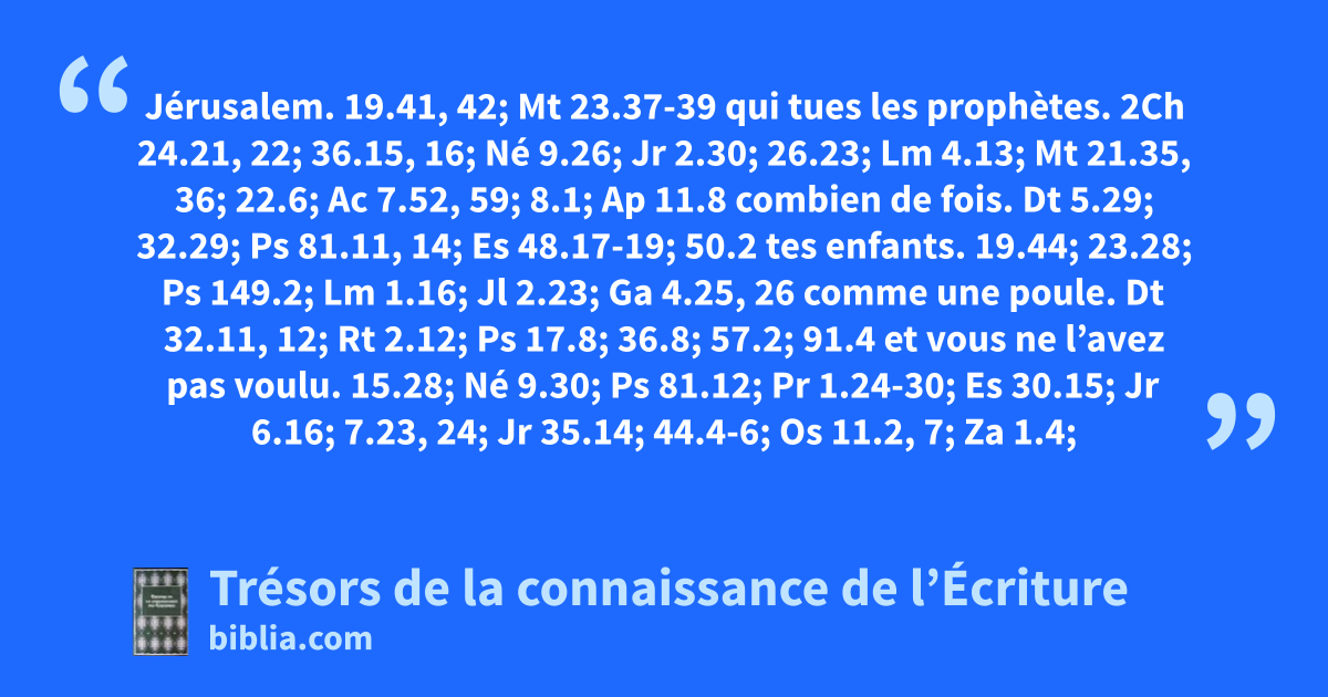 Jérusalem. 19.41, 42; Mt 23.37-39 qui tues les prophètes. 2Ch 24.21, 22; 36.15, 16; Né 9.26; Jr 2.30; 26.23; Lm 4.13; Mt 21.35, 36; 22.6; Ac 7.52, 59; 8.1; Ap 11.8 combien de fois. Dt 5.29; 32.29; Ps 81.11, 14; Es 48.17-19; 50.2 tes enfants. 19.44; 23.28; Ps 149.2; Lm 1.16; Jl 2.23; Ga 4.25, 26 comme une poule. Dt 32.11, 12; Rt 2.12; Ps 17.8; 36.8; 57.2; 91.4 et vous ne l’avez pas voulu. 15.28; Né 9.30; Ps 81.12; Pr 1.24-30; Es 30.15; Jr 6.16; 7.23, 24; Jr 35.14; 44.4-6; Os 11.2, 7; Za 1.4; Mt 22.3; Ac 3.14, 15