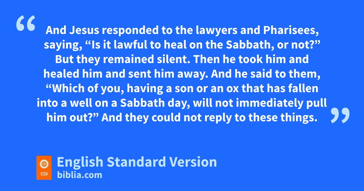 14 One Sabbath, pwhen he went to dine at the house of a ruler of the Pharisees, they were qwatching him carefully. 2 And behold, there was a man before him who had dropsy. 3 And Jesus responded to rthe lawyers and Pharisees, saying, s“Is it lawful to heal on the Sabbath, or not?” 4 But they remained silent. Then he took him and healed him and sent him away. 5 And he said to them, t“Which of you, having a son1 or an ox that has fallen into a well on a Sabbath day, will not immediately pull him out?” 6 uAnd they could not reply to these things.