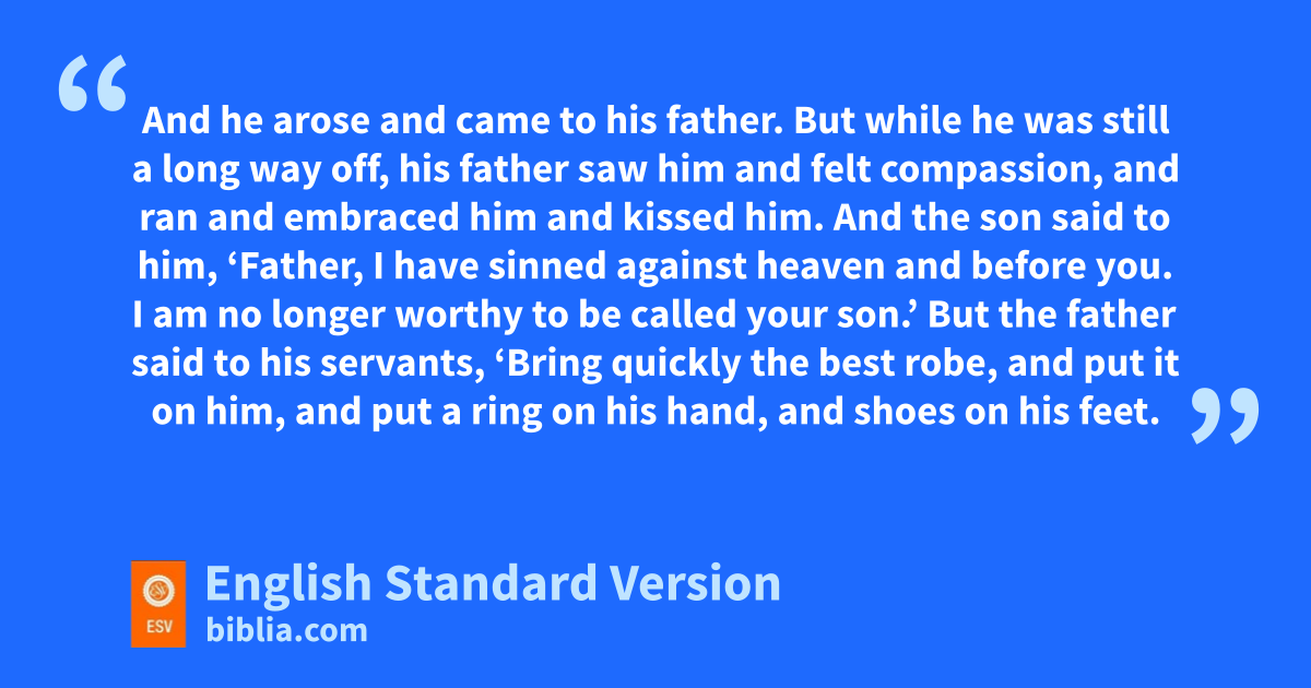 17 “But qwhen he rcame to himself, he said, ‘How many of my father’s hired servants have more than enough bread, but I perish here with hunger! 18 I will arise and go to my father, and I will say to him, “Father, sI have sinned against theaven and before you. 19 uI am no longer worthy to be called your son. Treat me as one of your hired servants.” ’ 20 And he arose and came to his father. But while he was still a long way off, his father saw him and felt compassion, and vran and wembraced him and xkissed him. 21 And the son said to him, ‘Father, I have sinned against heaven and before you. uI am no longer worthy to be called your son.’3 22 But the father said to his servants,4 ‘Bring quickly ythe best robe, and put it on him, and put za ring on his hand, and ashoes on his feet. 23 And bring bthe fattened calf and kill it, and clet us eat and celebrate. 24 For this my son dwas dead, and is alive again; he was lost, and is found.’ And they began to celebrate.
