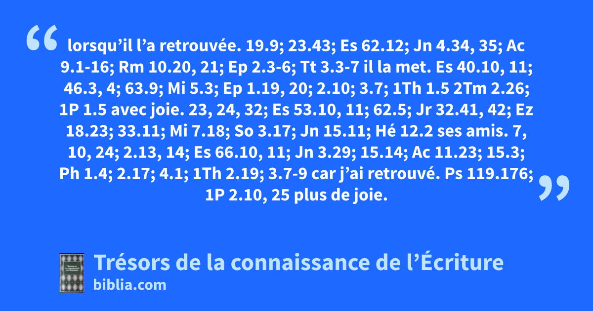 lorsqu’il l’a retrouvée. 19.9; 23.43; Es 62.12; Jn 4.34, 35; Ac 9.1-16; Rm 10.20, 21; Ep 2.3-6; Tt 3.3-7 il la met. Es 40.10, 11; 46.3, 4; 63.9; Mi 5.3; Ep 1.19, 20; 2.10; 3.7; 1Th 1.5 2Tm 2.26; 1P 1.5 avec joie. 23, 24, 32; Es 53.10, 11; 62.5; Jr 32.41, 42; Ez 18.23; 33.11; Mi 7.18; So 3.17; Jn 15.11; Hé 12.2
