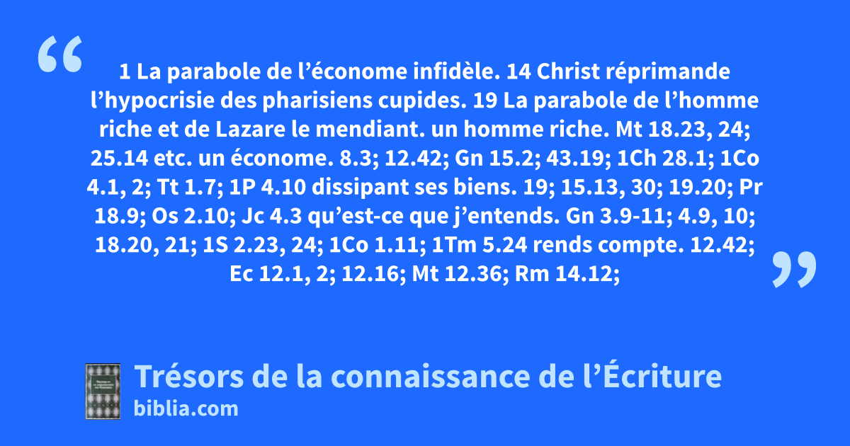 1 La parabole de l’économe infidèle. 14 Christ réprimande l’hypocrisie des pharisiens cupides. 19 La parabole de l’homme riche et de Lazare le mendiant.