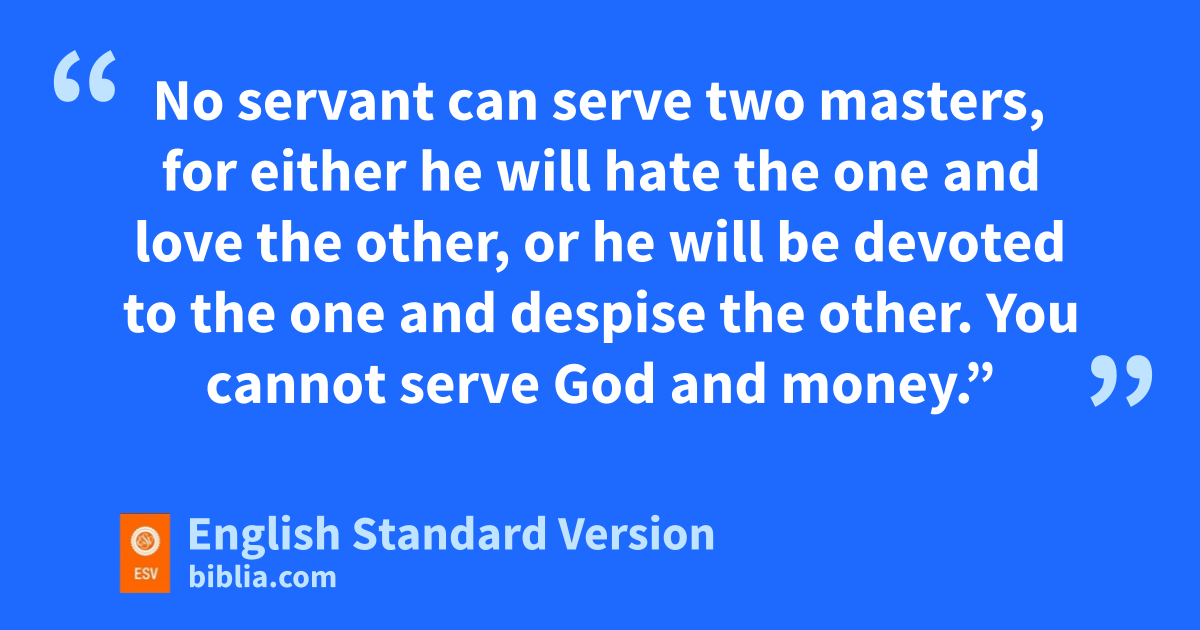 10 q“One who is rfaithful in a very little is also faithful in much, and one who is dishonest in a very little is also dishonest in much. 11 If then you have not been faithful in the unrighteous wealth, who will entrust to you the true riches? 12 And if you have not been faithful in sthat which is another’s, who will give you that which is your own? 13 pNo servant can serve two masters, for either he will hate the one and love the other, or he will be devoted to the one and despise the other. You cannot serve God and money.”
