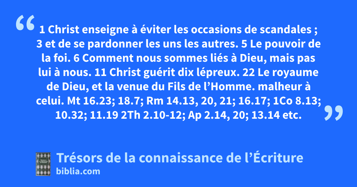 1 Christ enseigne à éviter les occasions de scandales ; 3 et de se pardonner les uns les autres. 5 Le pouvoir de la foi. 6 Comment nous sommes liés à Dieu, mais pas lui à nous. 11 Christ guérit dix lépreux. 22 Le royaume de Dieu, et la venue du Fils de l’Homme.