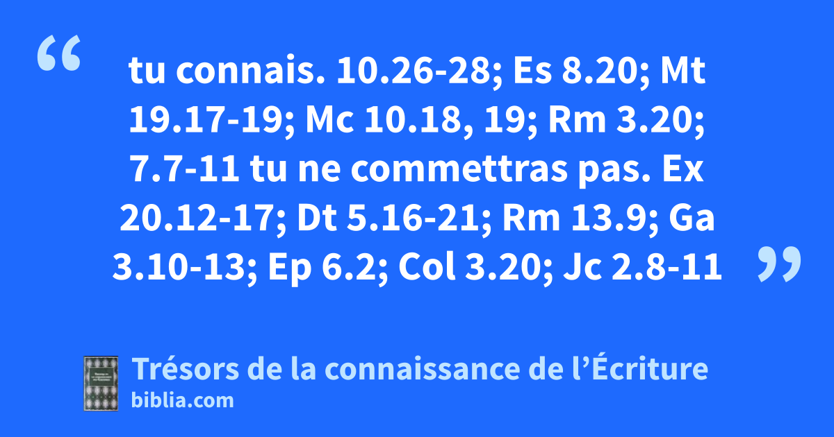 tu connais. 10.26-28; Es 8.20; Mt 19.17-19; Mc 10.18, 19; Rm 3.20; 7.7-11 tu ne commettras pas. Ex 20.12-17; Dt 5.16-21; Rm 13.9; Ga 3.10-13; Ep 6.2; Col 3.20; Jc 2.8-11