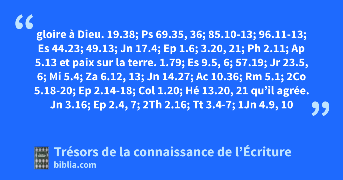 gloire à Dieu. 19.38; Ps 69.35, 36; 85.10-13; 96.11-13; Es 44.23; 49.13; Jn 17.4; Ep 1.6; 3.20, 21; Ph 2.11; Ap 5.13 et paix sur la terre. 1.79; Es 9.5, 6; 57.19; Jr 23.5, 6; Mi 5.4; Za 6.12, 13; Jn 14.27; Ac 10.36; Rm 5.1; 2Co 5.18-20; Ep 2.14-18; Col 1.20; Hé 13.20, 21 qu’il agrée. Jn 3.16; Ep 2.4, 7; 2Th 2.16; Tt 3.4-7; 1Jn 4.9, 10