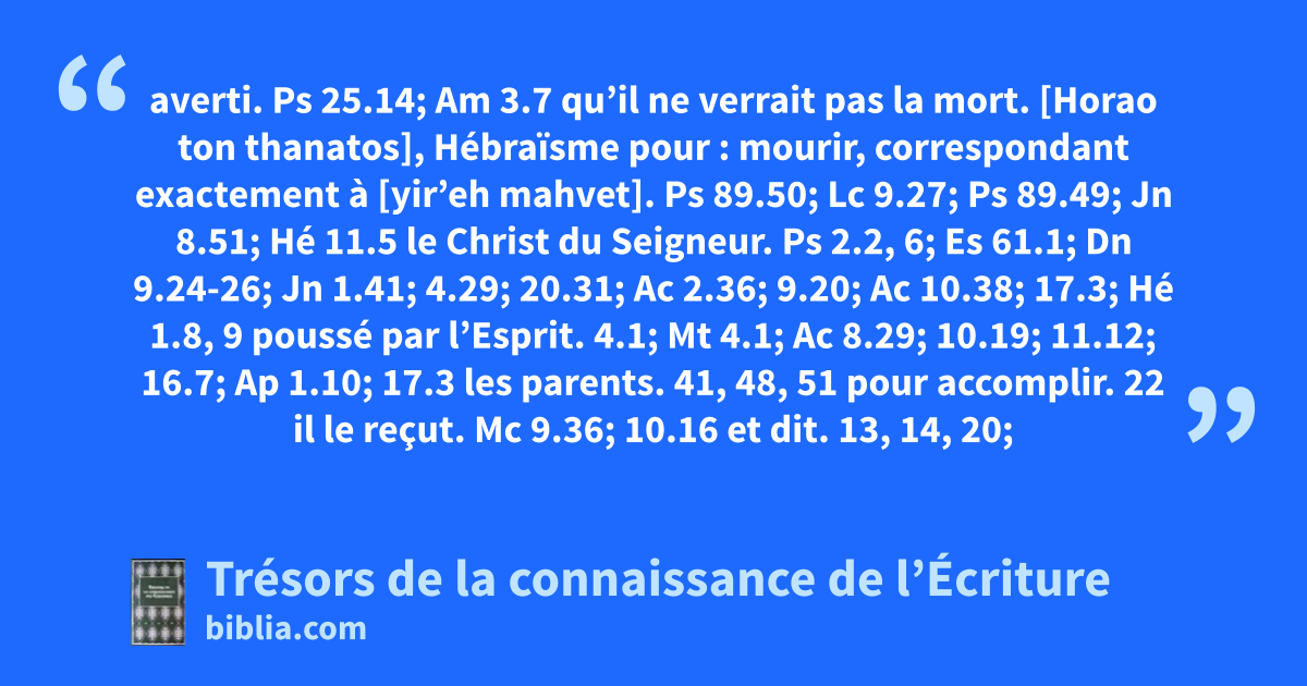 averti. Ps 25.14; Am 3.7 qu’il ne verrait pas la mort. [Horao ton thanatos], Hébraïsme pour : mourir, correspondant exactement à [yir’eh mahvet]. Ps 89.50; Lc 9.27; Ps 89.49; Jn 8.51; Hé 11.5 le Christ du Seigneur. Ps 2.2, 6; Es 61.1; Dn 9.24-26; Jn 1.41; 4.29; 20.31; Ac 2.36; 9.20; Ac 10.38; 17.3; Hé 1.8, 9