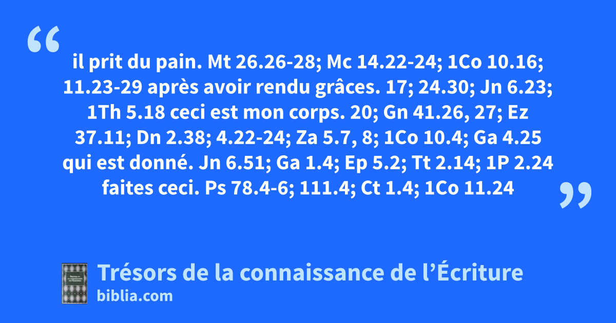 il prit du pain. Mt 26.26-28; Mc 14.22-24; 1Co 10.16; 11.23-29 après avoir rendu grâces. 17; 24.30; Jn 6.23; 1Th 5.18 ceci est mon corps. 20; Gn 41.26, 27; Ez 37.11; Dn 2.38; 4.22-24; Za 5.7, 8; 1Co 10.4; Ga 4.25 qui est donné. Jn 6.51; Ga 1.4; Ep 5.2; Tt 2.14; 1P 2.24 faites ceci. Ps 78.4-6; 111.4; Ct 1.4; 1Co 11.24