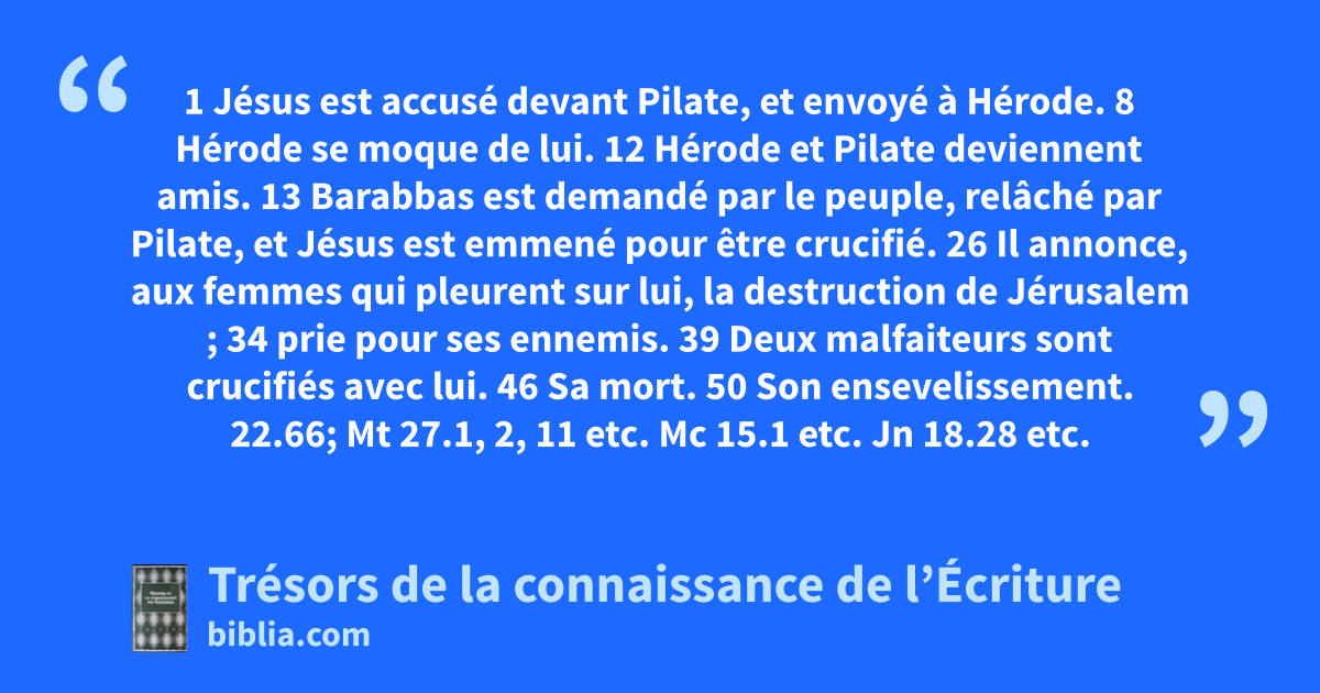 1 Jésus est accusé devant Pilate, et envoyé à Hérode. 8 Hérode se moque de lui. 12 Hérode et Pilate deviennent amis. 13 Barabbas est demandé par le peuple, relâché par Pilate, et Jésus est emmené pour être crucifié. 26 Il annonce, aux femmes qui pleurent sur lui, la destruction de Jérusalem ; 34 prie pour ses ennemis. 39 Deux malfaiteurs sont crucifiés avec lui. 46 Sa mort. 50 Son ensevelissement.