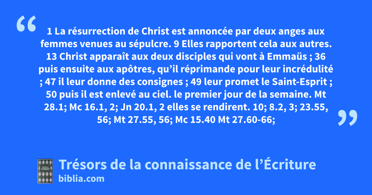 1 La résurrection de Christ est annoncée par deux anges aux femmes venues au sépulcre. 9 Elles rapportent cela aux autres. 13 Christ apparaît aux deux disciples qui vont à Emmaüs ; 36 puis ensuite aux apôtres, qu’il réprimande pour leur incrédulité ; 47 il leur donne des consignes ; 49 leur promet le Saint-Esprit ; 50 puis il est enlevé au ciel.