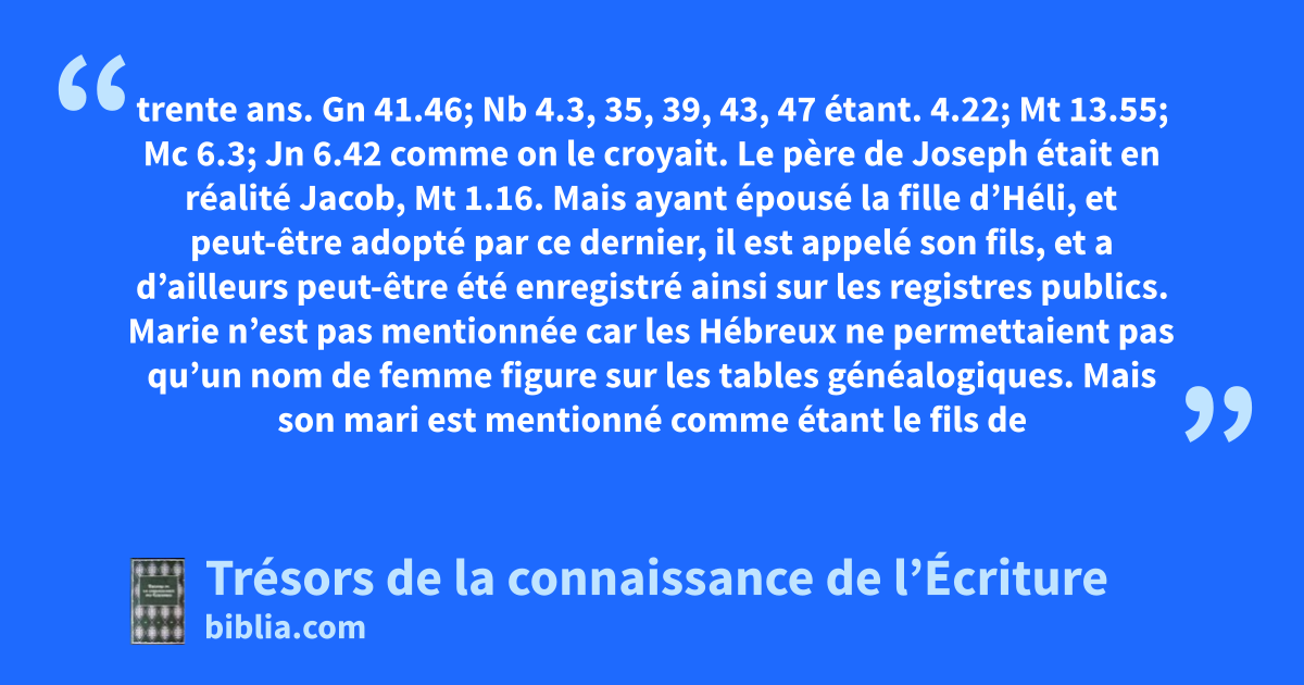 trente ans. Gn 41.46; Nb 4.3, 35, 39, 43, 47 étant. 4.22; Mt 13.55; Mc 6.3; Jn 6.42 comme on le croyait. Le père de Joseph était en réalité Jacob, Mt 1.16. Mais ayant épousé la fille d’Héli, et peut-être adopté par ce dernier, il est appelé son fils, et a d’ailleurs peut-être été enregistré ainsi sur les registres publics. Marie n’est pas mentionnée car les Hébreux ne permettaient pas qu’un nom de femme figure sur les tables généalogiques. Mais son mari est mentionné comme étant le fils de celui qui est en fait son beau-père. Il apparaît donc que Matthieu, qui écrivait principalement pour les Juifs, a tracé la généalogie de Jésus-Christ depuis Abraham, à travers qui les promesses ont été données aux Juifs, jusqu’à David ; puis de David, au travers de la lignée de Salomon, jusqu’à Jacob, le père de Joseph, légalement le père de Christ. Luc, qui écrivait pour les païens, développe sa généalogie par Héli, le père de Marie, au travers de la lignée de Nathan, jusqu’à David, puis de David à Abraham, et d’Abraham jusqu’à Adam, « fils de Dieu ». Les deux branches descendent de David, par Salomon ou Nathan, ce qui explique l’expression « fils de David » attachée à Jésus.