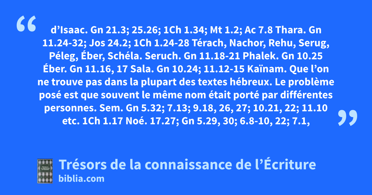 d’Isaac. Gn 21.3; 25.26; 1Ch 1.34; Mt 1.2; Ac 7.8 Thara. Gn 11.24-32; Jos 24.2; 1Ch 1.24-28 Térach, Nachor, Rehu, Serug, Péleg, Éber, Schéla.