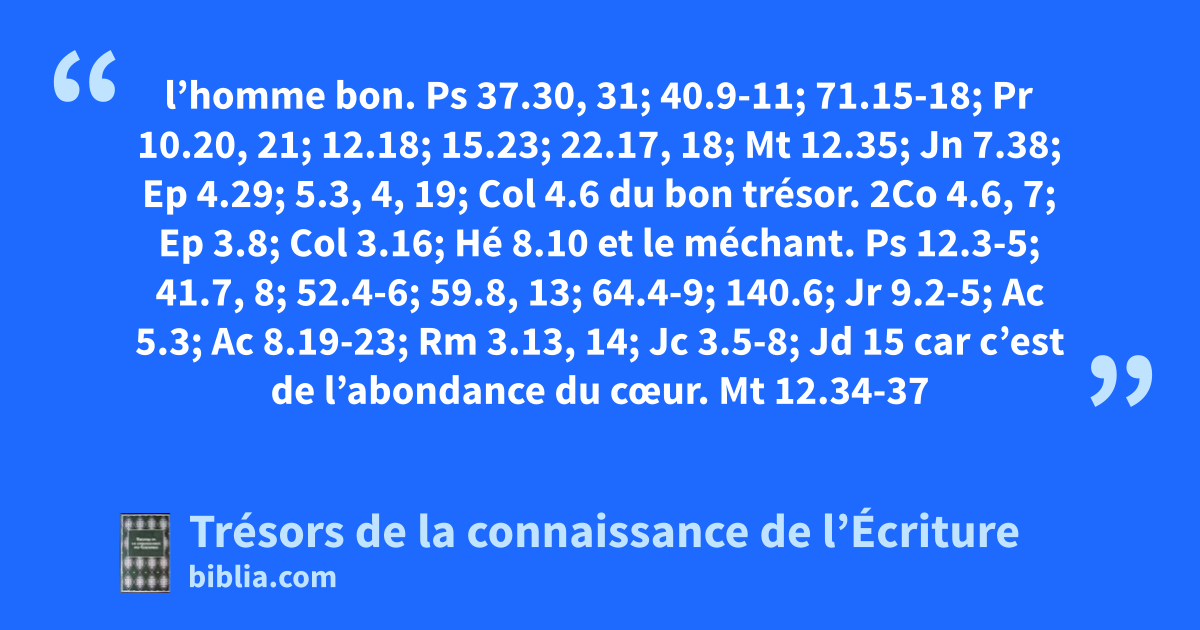 l’homme bon. Ps 37.30, 31; 40.9-11; 71.15-18; Pr 10.20, 21; 12.18; 15.23; 22.17, 18; Mt 12.35; Jn 7.38; Ep 4.29; 5.3, 4, 19; Col 4.6 du bon trésor. 2Co 4.6, 7; Ep 3.8; Col 3.16; Hé 8.10 et le méchant. Ps 12.3-5; 41.7, 8; 52.4-6; 59.8, 13; 64.4-9; 140.6; Jr 9.2-5; Ac 5.3; Ac 8.19-23; Rm 3.13, 14; Jc 3.5-8; Jd 15 car c’est de l’abondance du cœur. Mt 12.34-37