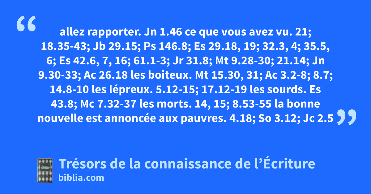 allez rapporter. Jn 1.46 ce que vous avez vu. 21; 18.35-43; Jb 29.15; Ps 146.8; Es 29.18, 19; 32.3, 4; 35.5, 6; Es 42.6, 7, 16; 61.1-3; Jr 31.8; Mt 9.28-30; 21.14; Jn 9.30-33; Ac 26.18 les boiteux. Mt 15.30, 31; Ac 3.2-8; 8.7; 14.8-10 les lépreux. 5.12-15; 17.12-19 les sourds. Es 43.8; Mc 7.32-37 les morts. 14, 15; 8.53-55 la bonne nouvelle est annoncée aux pauvres. 4.18; So 3.12; Jc 2.5