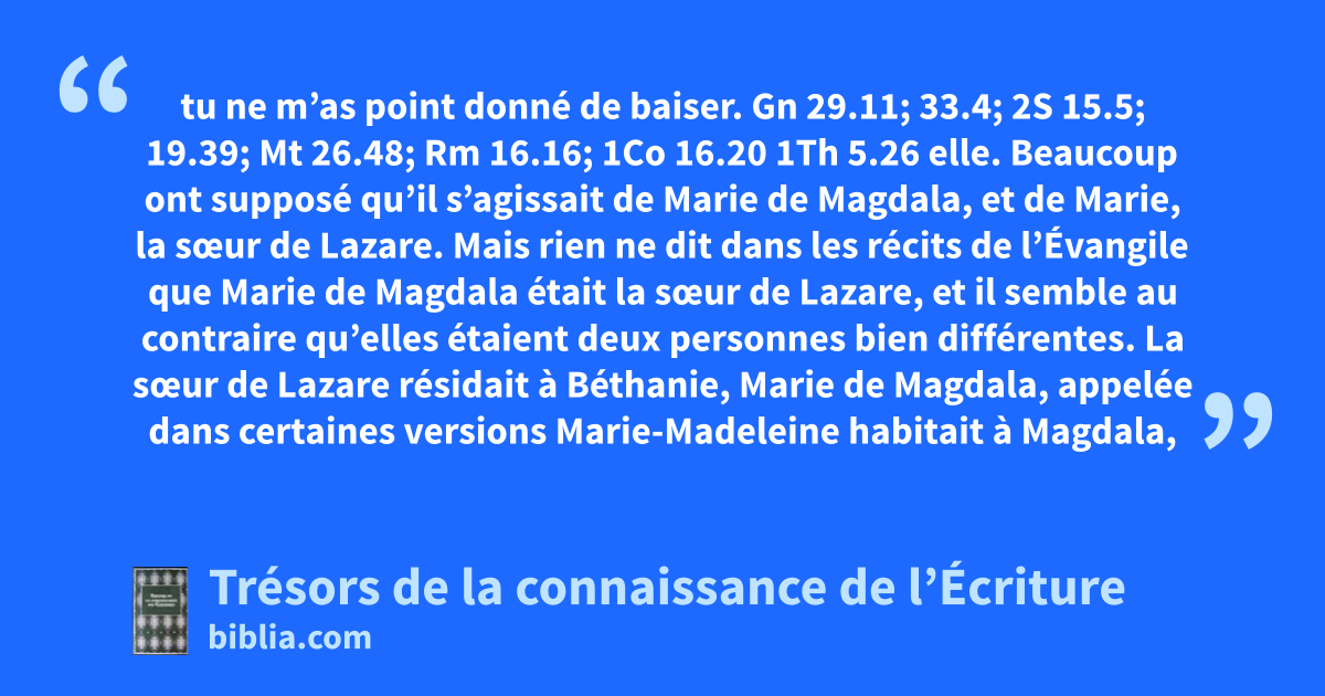 tu ne m’as point donné de baiser. Gn 29.11; 33.4; 2S 15.5; 19.39; Mt 26.48; Rm 16.16; 1Co 16.20 1Th 5.26 elle. Beaucoup ont supposé qu’il s’agissait de Marie de Magdala, et de Marie, la sœur de Lazare. Mais rien ne dit dans les récits de l’Évangile que Marie de Magdala était la sœur de Lazare, et il semble au contraire qu’elles étaient deux personnes bien différentes. La sœur de Lazare résidait à Béthanie, Marie de Magdala, appelée dans certaines versions Marie-Madeleine habitait à Magdala, à l’est du Jourdain, à plus de 100 km. Notre Seigneur était à ce moment-là à Naïn, non à Béthanie et il semble que la femme du récit lui était inconnue.