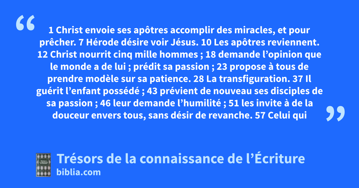 1 Christ envoie ses apôtres accomplir des miracles, et pour prêcher. 7 Hérode désire voir Jésus. 10 Les apôtres reviennent. 12 Christ nourrit cinq mille hommes ; 18 demande l’opinion que le monde a de lui ; prédit sa passion ; 23 propose à tous de prendre modèle sur sa patience. 28 La transfiguration. 37 Il guérit l’enfant possédé ; 43 prévient de nouveau ses disciples de sa passion ; 46 leur demande l’humilité ; 51 les invite à de la douceur envers tous, sans désir de revanche. 57 Celui qui veut le suivre doit accepter les conditions.