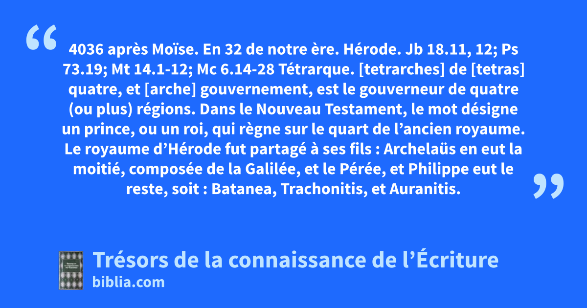 4036 après Moïse. En 32 de notre ère. Hérode. Jb 18.11, 12; Ps 73.19; Mt 14.1-12; Mc 6.14-28 Tétrarque. [tetrarches] de [tetras] quatre, et [arche] gouvernement, est le gouverneur de quatre (ou plus) régions. Dans le Nouveau Testament, le mot désigne un prince, ou un roi, qui règne sur le quart de l’ancien royaume. Le royaume d’Hérode fut partagé à ses fils : Archelaüs en eut la moitié, composée de la Galilée, et le Pérée, et Philippe eut le reste, soit : Batanea, Trachonitis, et Auranitis. il ne savait. 21.25; Es 22.5; Mi 7.4