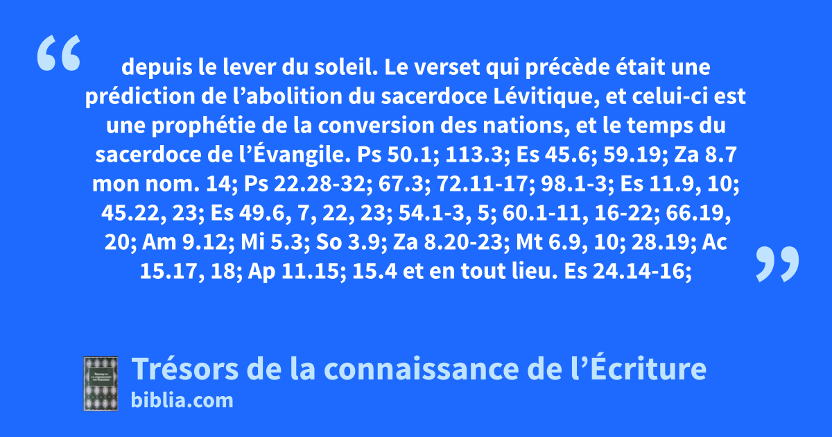 depuis le lever du soleil. Le verset qui précède était une prédiction de l’abolition du sacerdoce Lévitique, et celui-ci est une prophétie de la conversion des nations, et le temps du sacerdoce de l’Évangile. Ps 50.1; 113.3; Es 45.6; 59.19; Za 8.7 mon nom. 14; Ps 22.28-32; 67.3; 72.11-17; 98.1-3; Es 11.9, 10; 45.22, 23; Es 49.6, 7, 22, 23; 54.1-3, 5; 60.1-11, 16-22; 66.19, 20; Am 9.12; Mi 5.3; So 3.9; Za 8.20-23; Mt 6.9, 10; 28.19; Ac 15.17, 18; Ap 11.15; 15.4 et en tout lieu. Es 24.14-16; 42.10-12; So 2.11; Jn 4.21-23; Ac 10.30-35; Rm 15.9-11, 16; 1Tm 2.8; Ap 8.3 de l’encens. Ps 141.2; Es 60.6; Lc 1.10; Rm 12.1; Ph 4.18; Hé 13.15, 16; Ap 5.8; 8.3, 4 car grand est mon nom. Es 66.19, 20