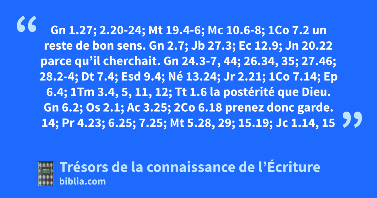 Gn 1.27; 2.20-24; Mt 19.4-6; Mc 10.6-8; 1Co 7.2 un reste de bon sens. Gn 2.7; Jb 27.3; Ec 12.9; Jn 20.22 parce qu’il cherchait. Gn 24.3-7, 44; 26.34, 35; 27.46; 28.2-4; Dt 7.4; Esd 9.4; Né 13.24; Jr 2.21; 1Co 7.14; Ep 6.4; 1Tm 3.4, 5, 11, 12; Tt 1.6 la postérité que Dieu. Gn 6.2; Os 2.1; Ac 3.25; 2Co 6.18 prenez donc garde. 14; Pr 4.23; 6.25; 7.25; Mt 5.28, 29; 15.19; Jc 1.14, 15