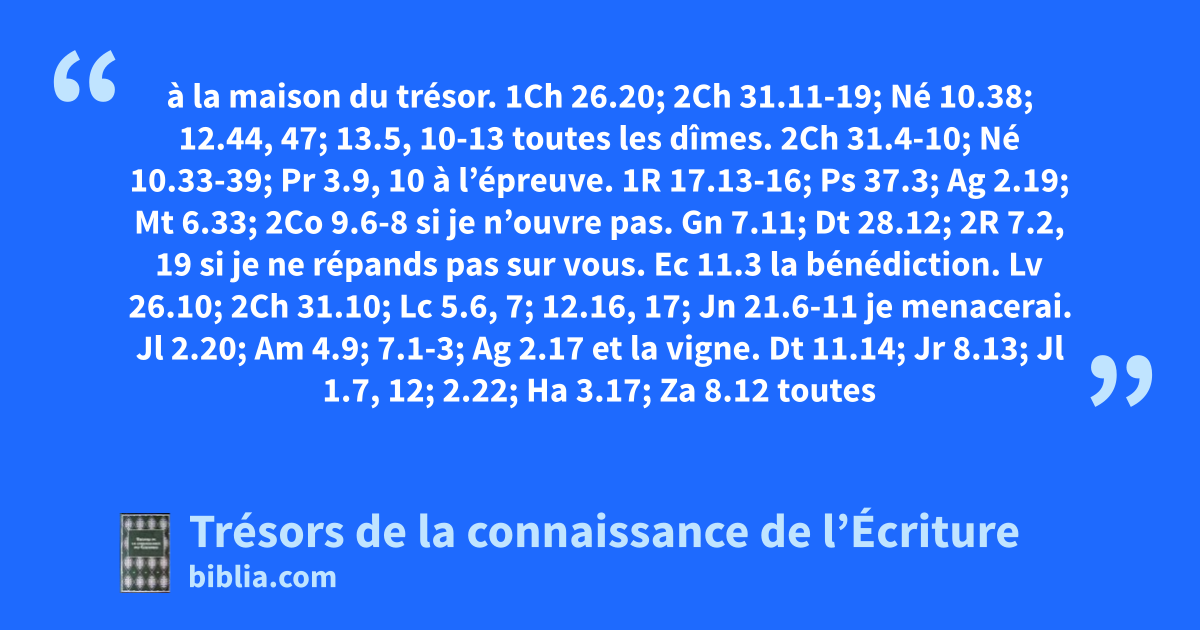 à la maison du trésor. 1Ch 26.20; 2Ch 31.11-19; Né 10.38; 12.44, 47; 13.5, 10-13 toutes les dîmes. 2Ch 31.4-10; Né 10.33-39; Pr 3.9, 10 à l’épreuve. 1R 17.13-16; Ps 37.3; Ag 2.19; Mt 6.33; 2Co 9.6-8 si je n’ouvre pas. Gn 7.11; Dt 28.12; 2R 7.2, 19 si je ne répands pas sur vous. Ec 11.3 la bénédiction. Lv 26.10; 2Ch 31.10; Lc 5.6, 7; 12.16, 17; Jn 21.6-11