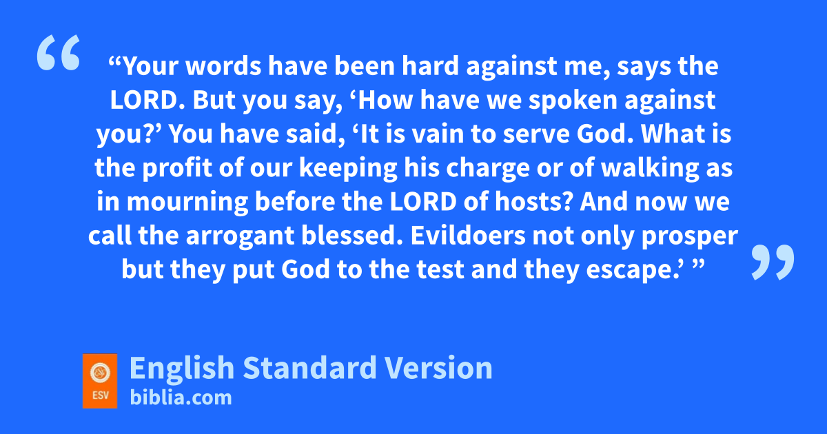 13 g“Your words have been hard against me, says the Lord. hBut you say, ‘How have we spoken against you?’ 14 You have said, i‘It is vain to serve God. jWhat is the profit of our keeping his charge or of walking as in mourning before the Lord of hosts? 15 And now we call kthe arrogant blessed. kEvildoers not only prosper but lthey put God to the test and they escape.’ ”