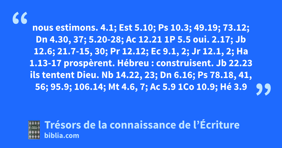 nous estimons. 4.1; Est 5.10; Ps 10.3; 49.19; 73.12; Dn 4.30, 37; 5.20-28; Ac 12.21 1P 5.5 oui. 2.17; Jb 12.6; 21.7-15, 30; Pr 12.12; Ec 9.1, 2; Jr 12.1, 2; Ha 1.13-17 prospèrent. Hébreu : construisent. Jb 22.23 ils tentent Dieu. Nb 14.22, 23; Dn 6.16; Ps 78.18, 41, 56; 95.9; 106.14; Mt 4.6, 7; Ac 5.9 1Co 10.9; Hé 3.9