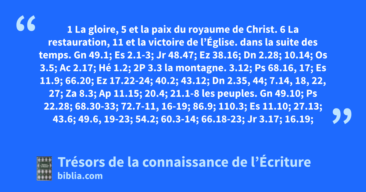 1 La gloire, 5 et la paix du royaume de Christ. 6 La restauration, 11 et la victoire de l’Église.