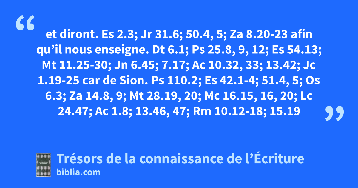et diront. Es 2.3; Jr 31.6; 50.4, 5; Za 8.20-23 afin qu’il nous enseigne. Dt 6.1; Ps 25.8, 9, 12; Es 54.13; Mt 11.25-30; Jn 6.45; 7.17; Ac 10.32, 33; 13.42; Jc 1.19-25 car de Sion. Ps 110.2; Es 42.1-4; 51.4, 5; Os 6.3; Za 14.8, 9; Mt 28.19, 20; Mc 16.15, 16, 20; Lc 24.47; Ac 1.8; 13.46, 47; Rm 10.12-18; 15.19