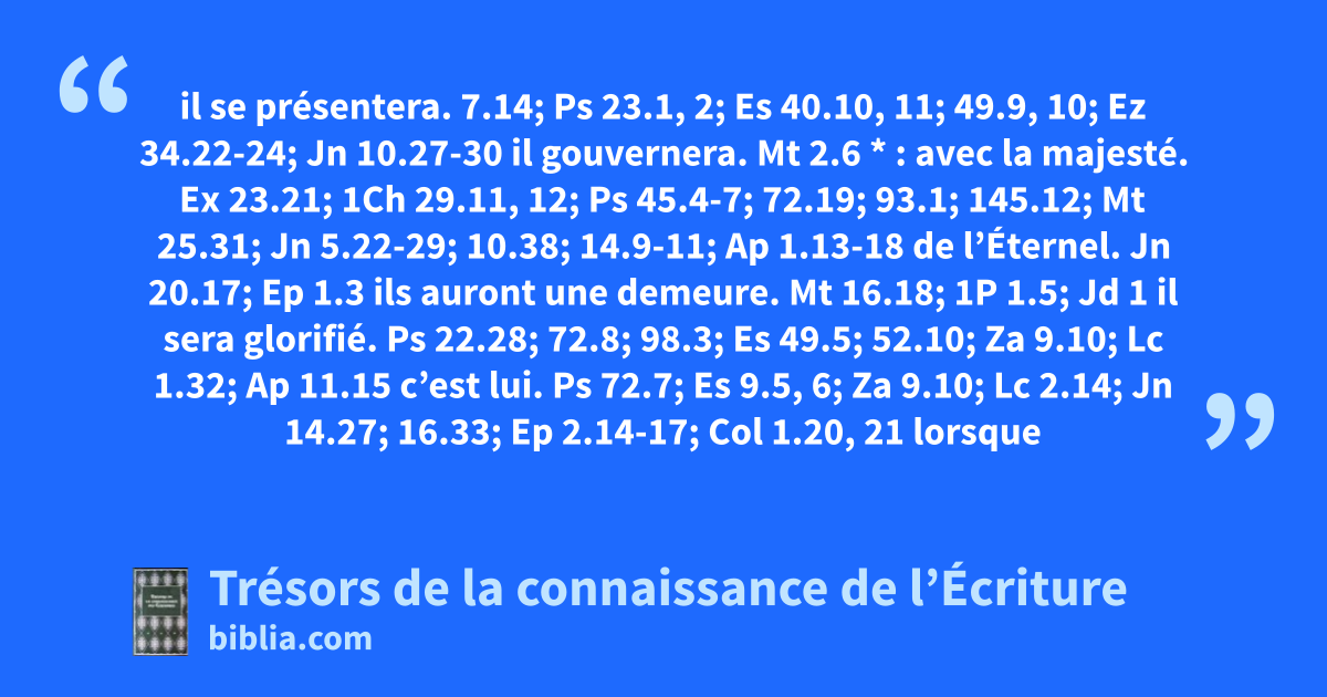 il se présentera. 7.14; Ps 23.1, 2; Es 40.10, 11; 49.9, 10; Ez 34.22-24; Jn 10.27-30 il gouvernera. Mt 2.6 * : avec la majesté. Ex 23.21; 1Ch 29.11, 12; Ps 45.4-7; 72.19; 93.1; 145.12; Mt 25.31; Jn 5.22-29; 10.38; 14.9-11; Ap 1.13-18 de l’Éternel. Jn 20.17; Ep 1.3 ils auront une demeure. Mt 16.18; 1P 1.5; Jd 1 il sera glorifié. Ps 22.28; 72.8; 98.3; Es 49.5; 52.10; Za 9.10; Lc 1.32; Ap 11.15