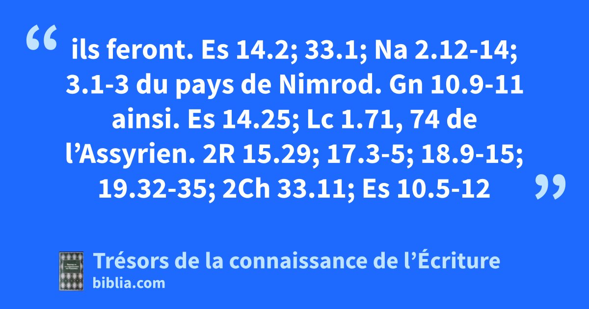 ils feront. Es 14.2; 33.1; Na 2.12-14; 3.1-3 du pays de Nimrod. Gn 10.9-11 ainsi. Es 14.25; Lc 1.71, 74 de l’Assyrien. 2R 15.29; 17.3-5; 18.9-15; 19.32-35; 2Ch 33.11; Es 10.5-12