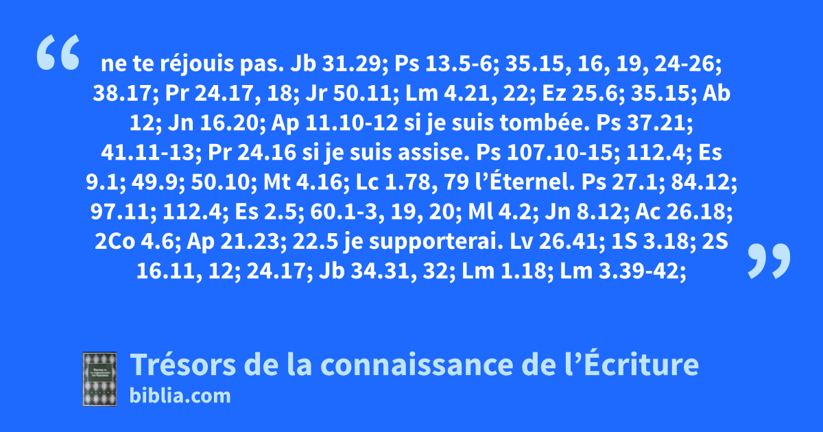 ne te réjouis pas. Jb 31.29; Ps 13.5-6; 35.15, 16, 19, 24-26; 38.17; Pr 24.17, 18; Jr 50.11; Lm 4.21, 22; Ez 25.6; 35.15; Ab 12; Jn 16.20; Ap 11.10-12 si je suis tombée. Ps 37.21; 41.11-13; Pr 24.16 si je suis assise. Ps 107.10-15; 112.4; Es 9.1; 49.9; 50.10; Mt 4.16; Lc 1.78, 79 l’Éternel. Ps 27.1; 84.12; 97.11; 112.4; Es 2.5; 60.1-3, 19, 20; Ml 4.2; Jn 8.12; Ac 26.18; 2Co 4.6; Ap 21.23; 22.5