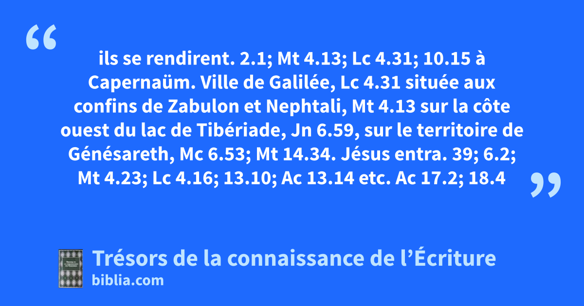 ils se rendirent. 2.1; Mt 4.13; Lc 4.31; 10.15 à Capernaüm. Ville de Galilée, Lc 4.31 située aux confins de Zabulon et Nephtali, Mt 4.13 sur la côte ouest du lac de Tibériade, Jn 6.59, sur le territoire de Génésareth, Mc 6.53; Mt 14.34. Jésus entra. 39; 6.2; Mt 4.23; Lc 4.16; 13.10; Ac 13.14 etc. Ac 17.2; 18.4