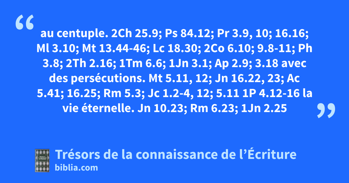 au centuple. 2Ch 25.9; Ps 84.12; Pr 3.9, 10; 16.16; Ml 3.10; Mt 13.44-46; Lc 18.30; 2Co 6.10; 9.8-11; Ph 3.8; 2Th 2.16; 1Tm 6.6; 1Jn 3.1; Ap 2.9; 3.18 avec des persécutions. Mt 5.11, 12; Jn 16.22, 23; Ac 5.41; 16.25; Rm 5.3; Jc 1.2-4, 12; 5.11 1P 4.12-16 la vie éternelle. Jn 10.23; Rm 6.23; 1Jn 2.25