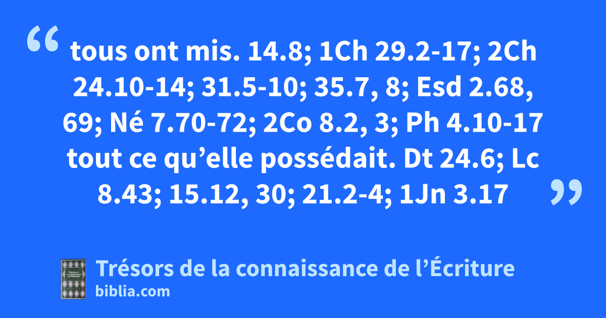 tous ont mis. 14.8; 1Ch 29.2-17; 2Ch 24.10-14; 31.5-10; 35.7, 8; Esd 2.68, 69; Né 7.70-72; 2Co 8.2, 3; Ph 4.10-17 tout ce qu’elle possédait. Dt 24.6; Lc 8.43; 15.12, 30; 21.2-4; 1Jn 3.17