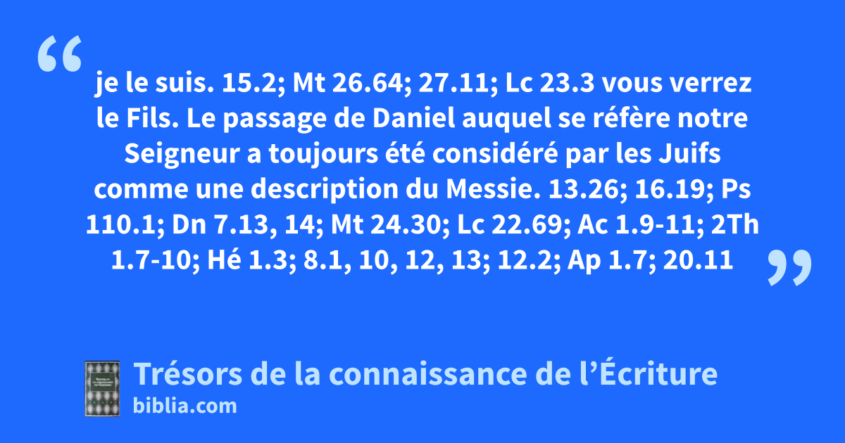 je le suis. 15.2; Mt 26.64; 27.11; Lc 23.3 vous verrez le Fils. Le passage de Daniel auquel se réfère notre Seigneur a toujours été considéré par les Juifs comme une description du Messie. 13.26; 16.19; Ps 110.1; Dn 7.13, 14; Mt 24.30; Lc 22.69; Ac 1.9-11; 2Th 1.7-10; Hé 1.3; 8.1, 10, 12, 13; 12.2; Ap 1.7; 20.11