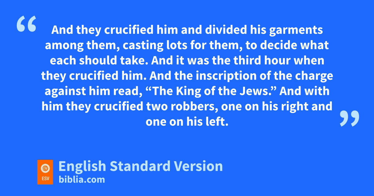 21 dAnd they compelled a passerby, Simon of Cyrene, who was coming in from the country, the father of Alexander and Rufus, to carry his cross. 22 eAnd they brought him to the place called Golgotha (which means Place of a Skull). 23 And they offered him wine mixed with fmyrrh, but he did not take it. 24 And they crucified him and gdivided his garments among them, casting lots for them, to decide what each should take. 25 And hit was the third hour4 when they crucified him. 26 And the inscription of the charge against him read, i“The King of the Jews.” 27 And with him they crucified two jrobbers, kone on his right and one on his left.5 29 And lthose who passed by derided him, mwagging their heads and saying, n“Aha! oYou who would destroy the temple and rebuild it in three days, 30 save yourself, and come down from the cross!” 31 So also the chief priests with the scribes mocked him to one another, saying, p“He saved others; qhe cannot save himself. 32 Let rthe Christ, sthe King of Israel, come down now from the cross that we may tsee and believe.” uThose who were crucified with him also reviled him.