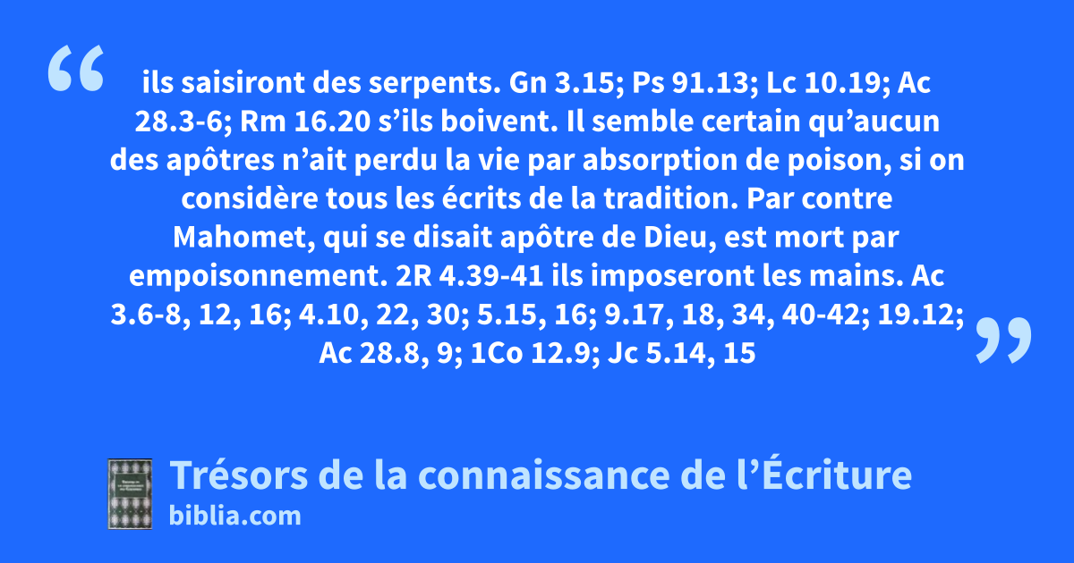 ils saisiront des serpents. Gn 3.15; Ps 91.13; Lc 10.19; Ac 28.3-6; Rm 16.20 s’ils boivent. Il semble certain qu’aucun des apôtres n’ait perdu la vie par absorption de poison, si on considère tous les écrits de la tradition. Par contre Mahomet, qui se disait apôtre de Dieu, est mort par empoisonnement. 2R 4.39-41 ils imposeront les mains. Ac 3.6-8, 12, 16; 4.10, 22, 30; 5.15, 16; 9.17, 18, 34, 40-42; 19.12; Ac 28.8, 9; 1Co 12.9; Jc 5.14, 15