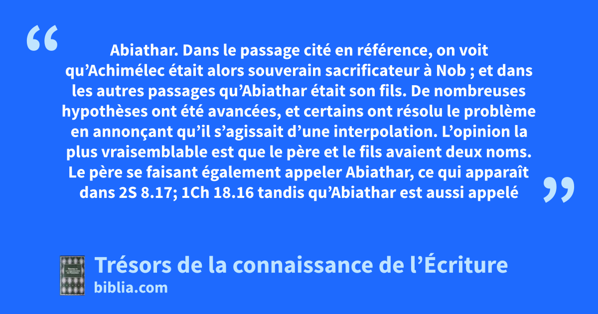 Abiathar. Dans le passage cité en référence, on voit qu’Achimélec était alors souverain sacrificateur à Nob ; et dans les autres passages qu’Abiathar était son fils. De nombreuses hypothèses ont été avancées, et certains ont résolu le problème en annonçant qu’il s’agissait d’une interpolation. L’opinion la plus vraisemblable est que le père et le fils avaient deux noms. Le père se faisant également appeler Abiathar, ce qui apparaît dans 2S 8.17; 1Ch 18.16 tandis qu’Abiathar est aussi appelé Achimélec ou Abimélec. Voir : 1R 2.26, 27 1S 22.20-22; 23.6, 9; 2S 8.17; 15.24, 29, 35; 20.25 1R 1.7; 2.22, 26, 27; 4.4 qu’il n’est permis qu’aux sacrificateurs. Ex 29.32, 33; Lv 24.5-9