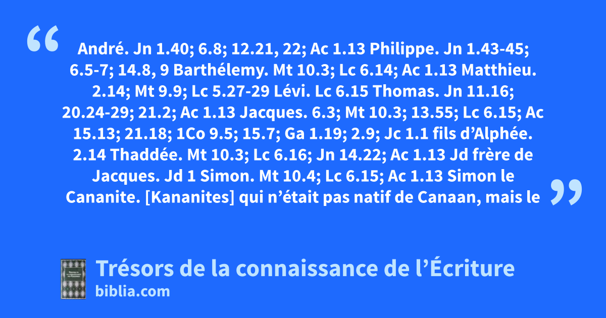 André. Jn 1.40; 6.8; 12.21, 22; Ac 1.13 Philippe. Jn 1.43-45; 6.5-7; 14.8, 9 Barthélemy. Mt 10.3; Lc 6.14; Ac 1.13 Matthieu. 2.14; Mt 9.9; Lc 5.27-29 Lévi. Lc 6.15 Thomas. Jn 11.16; 20.24-29; 21.2; Ac 1.13 Jacques. 6.3; Mt 10.3; 13.55; Lc 6.15; Ac 15.13; 21.18; 1Co 9.5; 15.7; Ga 1.19; 2.9; Jc 1.1 fils d’Alphée. 2.14 Thaddée. Mt 10.3; Lc 6.16; Jn 14.22; Ac 1.13 Jd frère de Jacques. Jd 1 Simon. Mt 10.4; Lc 6.15; Ac 1.13 Simon le Cananite. [Kananites] qui n’était pas natif de Canaan, mais le mot hébreu est Kana : être zélé, d’où le mot grec : [Zelotes]