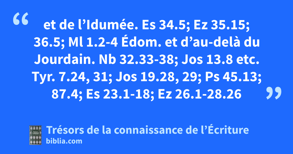 et de l’Idumée. Es 34.5; Ez 35.15; 36.5; Ml 1.2-4 Édom. et d’au-delà du Jourdain. Nb 32.33-38; Jos 13.8 etc. Tyr. 7.24, 31; Jos 19.28, 29; Ps 45.13; 87.4; Es 23.1-18; Ez 26.1-28.26