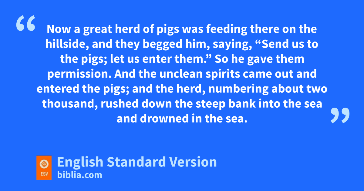 5 uThey came to the other side of the sea, to the country of the Gerasenes.1 2 And when Jesus2 had stepped out of the boat, immediately there met him out of the tombs a man with an unclean spirit. 3 vHe lived among the tombs. And no one could bind him anymore, not even with a chain, 4 for he had often been bound with shackles and chains, but he wrenched the chains apart, and he broke the shackles in pieces. No one had the strength to subdue him. 5 Night and day among the tombs and on the mountains he was always crying out and cutting himself with stones. 6 And when he saw Jesus from afar, he ran and wfell down before him. 7 And xcrying out with a loud voice, he said, “What have you to do with me, Jesus, ySon of zthe Most High God? aI adjure you by God, do not torment me.” 8 For he was saying to him, “Come out of the man, you unclean spirit!” 9 And Jesus asked him, “What is your name?” He replied, “My name is bLegion, for we are many.” 10 And he begged him earnestly not to send them out of the country. 11 Now a great herd of pigs was feeding there on the hillside, 12 and they begged him, saying, “Send us to the pigs; let us enter them.” 13 So he gave them permission. And the unclean spirits came out and entered the pigs; and the herd, numbering about two thousand, rushed down the steep bank into the sea and drowned in the sea.
