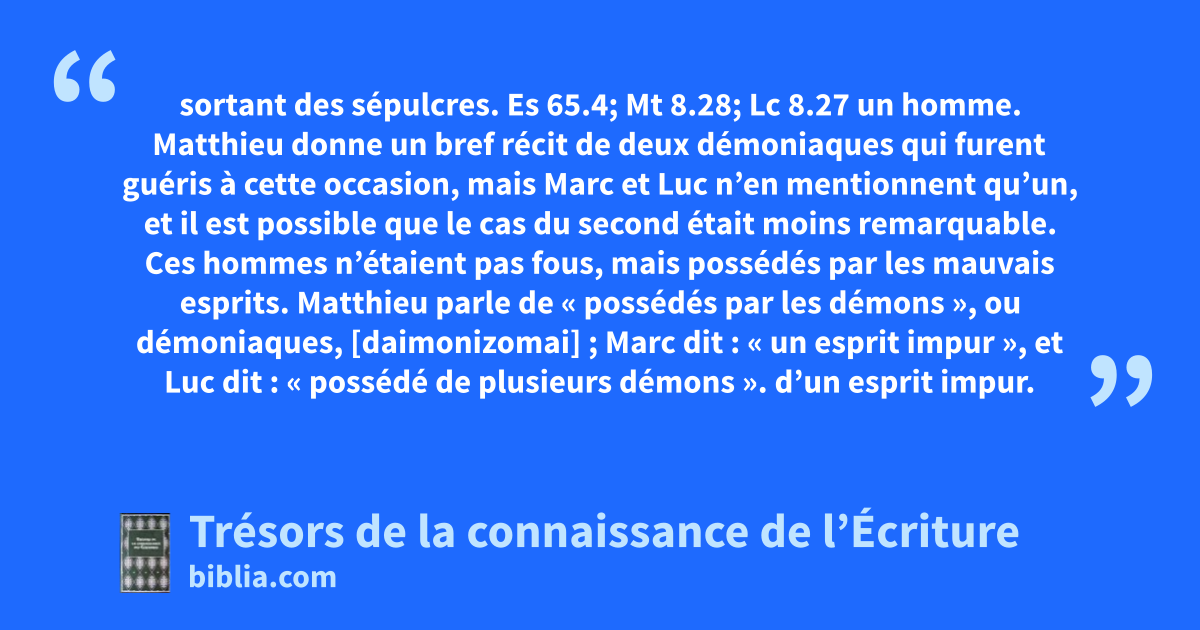 sortant des sépulcres. Es 65.4; Mt 8.28; Lc 8.27 un homme. Matthieu donne un bref récit de deux démoniaques qui furent guéris à cette occasion, mais Marc et Luc n’en mentionnent qu’un, et il est possible que le cas du second était moins remarquable. Ces hommes n’étaient pas fous, mais possédés par les mauvais esprits. Matthieu parle de « possédés par les démons », ou démoniaques, [daimonizomai] ; Marc dit : « un esprit impur », et Luc dit : « possédé de plusieurs démons ». d’un esprit impur. 8; 1.23, 26; 3.30; 7.25; Lc 9.42