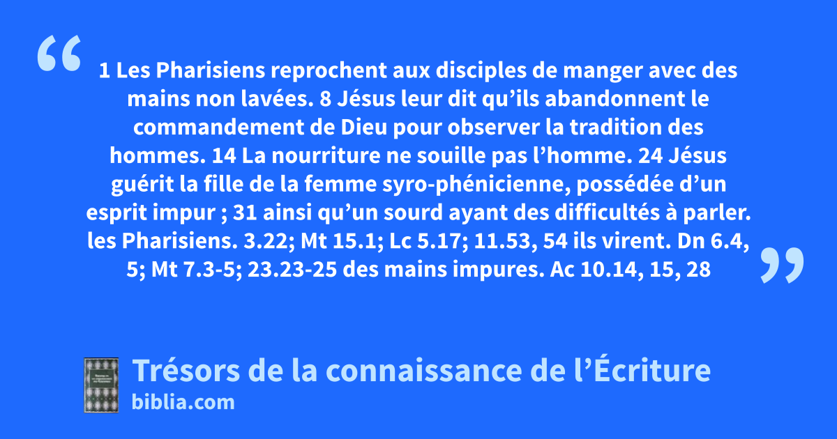 1 Les Pharisiens reprochent aux disciples de manger avec des mains non lavées. 8 Jésus leur dit qu’ils abandonnent le commandement de Dieu pour observer la tradition des hommes. 14 La nourriture ne souille pas l’homme. 24 Jésus guérit la fille de la femme syro-phénicienne, possédée d’un esprit impur ; 31 ainsi qu’un sourd ayant des difficultés à parler.