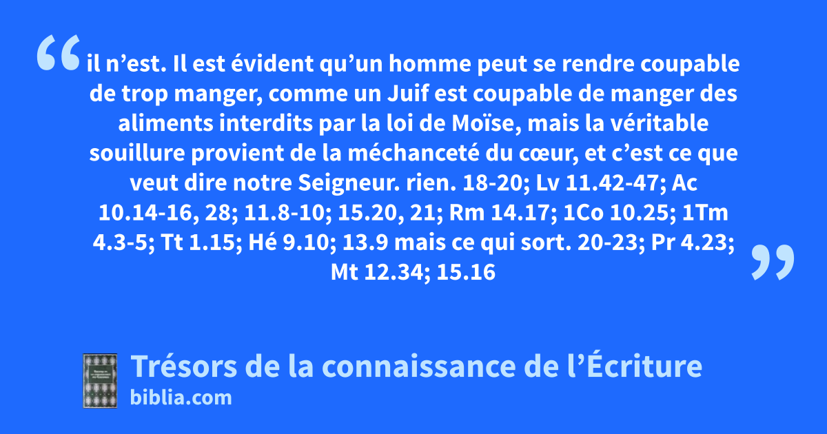 il n’est. Il est évident qu’un homme peut se rendre coupable de trop manger, comme un Juif est coupable de manger des aliments interdits par la loi de Moïse, mais la véritable souillure provient de la méchanceté du cœur, et c’est ce que veut dire notre Seigneur. rien. 18-20; Lv 11.42-47; Ac 10.14-16, 28; 11.8-10; 15.20, 21; Rm 14.17; 1Co 10.25; 1Tm 4.3-5; Tt 1.15; Hé 9.10; 13.9 mais ce qui sort. 20-23; Pr 4.23; Mt 12.34; 15.16