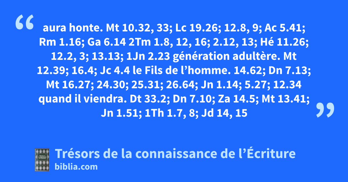 aura honte. Mt 10.32, 33; Lc 19.26; 12.8, 9; Ac 5.41; Rm 1.16; Ga 6.14 2Tm 1.8, 12, 16; 2.12, 13; Hé 11.26; 12.2, 3; 13.13; 1Jn 2.23 génération adultère. Mt 12.39; 16.4; Jc 4.4 le Fils de l’homme. 14.62; Dn 7.13; Mt 16.27; 24.30; 25.31; 26.64; Jn 1.14; 5.27; 12.34 quand il viendra. Dt 33.2; Dn 7.10; Za 14.5; Mt 13.41; Jn 1.51; 1Th 1.7, 8; Jd 14, 15