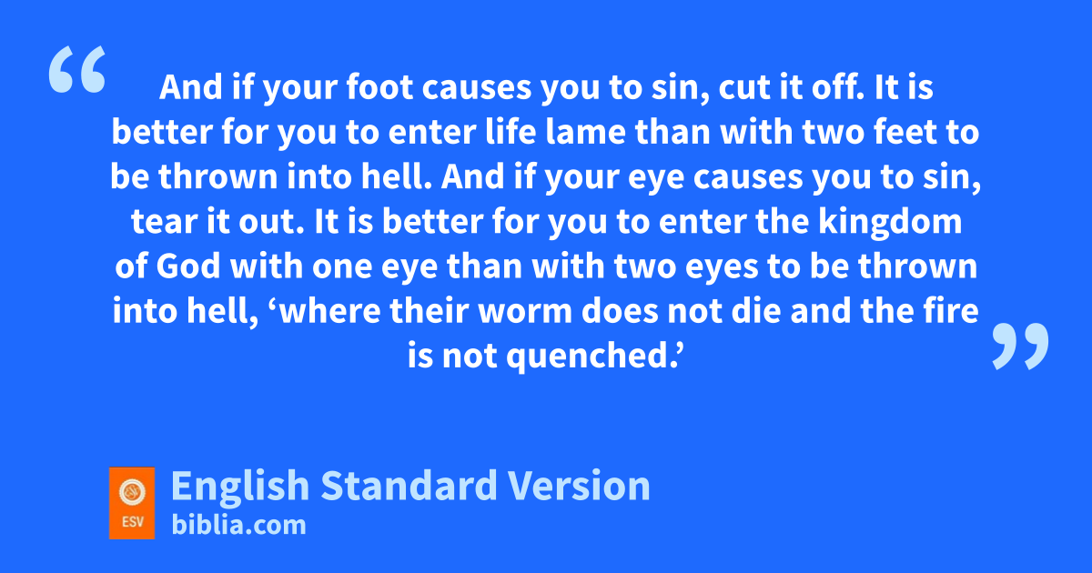 42 k“Whoever causes one of lthese little ones who believe in me to sin,8 mit would be better for him if a great millstone were hung around his neck and he were thrown into the sea. 43 nAnd if your hand causes you to sin, cut it off. It is better for you to enter life crippled than with two hands to go to ohell,9 to pthe unquenchable fire.10 45 qAnd if your foot causes you to sin, cut it off. It is better for you to enter life lame than with two feet to be thrown into ohell. 47 rAnd if your eye causes you to sin, tear it out. It is better for you to enter the kingdom of God with one eye than with two eyes to be thrown into shell, 48 ‘where ttheir worm does not die and the fire is not quenched.’ 49 For everyone will be salted with fire.11 50 vSalt is good, wbut if the salt has lost its saltiness, how will you make it salty again? xHave salt in yourselves, and ybe at peace with one another.”